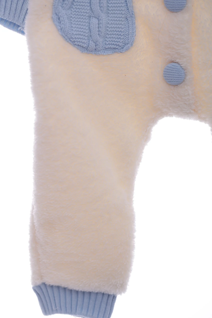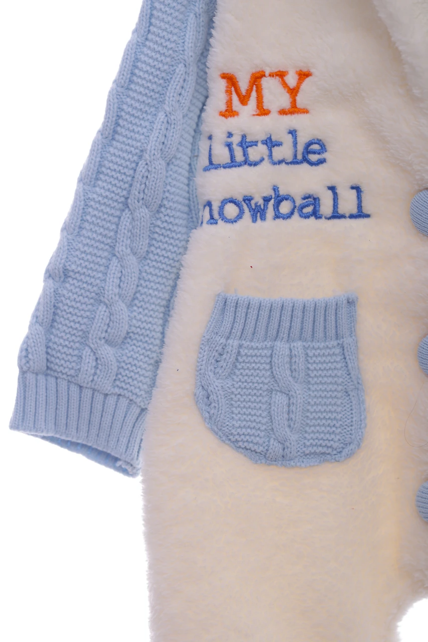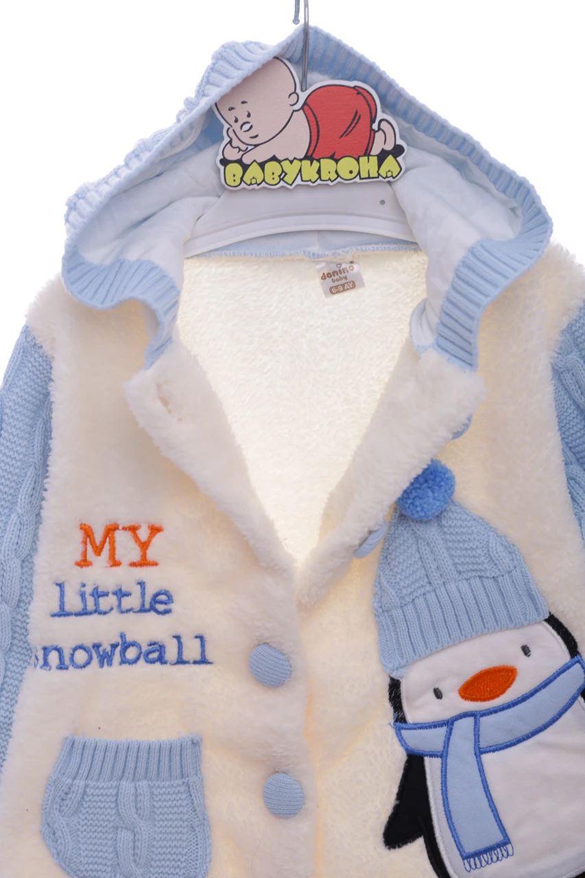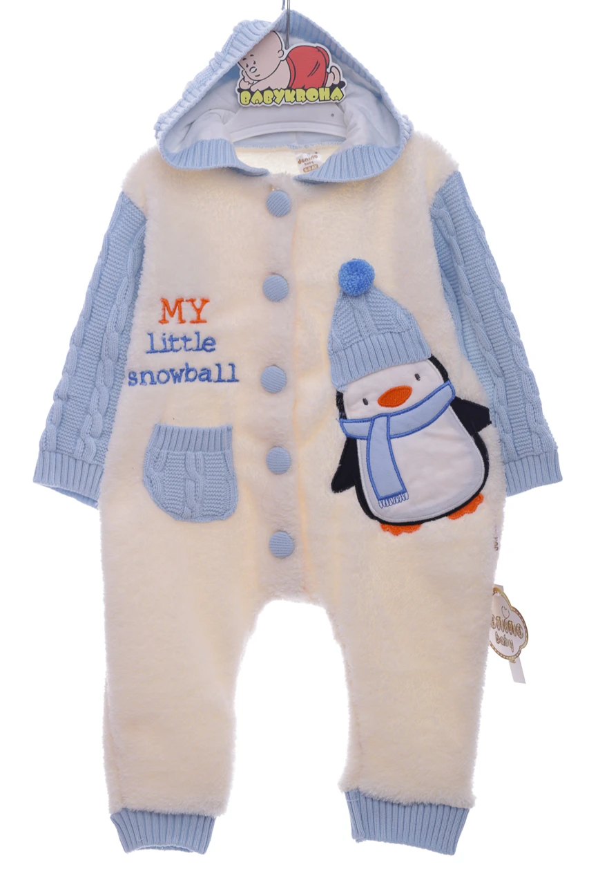 Травка чоловічок для хлопчика. Застібається на гудзики, на рукавах та ніжках є манжети. Капюшон із в'язаною окантовкою, рукави та манжети також виконані з трикотажної в'язки. На чоловічку є принт нашивка у вигляді пінгвіна.