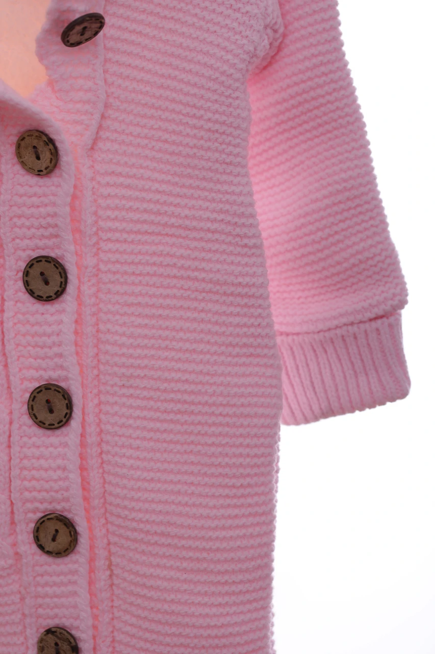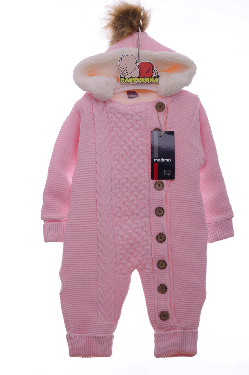 Дитячий трикотажні чоловічок для дівчинки на хутро. Він призначений на весну-осінь, все залежить від активності вашого малюка. Можна одягати зверху вітровку з плащової тканини і під час дощу малюкові не загрожує промокнути. Є капюшон із бубоном, а це додатковий захист від вітру. На рукавах та ніжках манжети, а гудзики застібки по всій довжині виробу.