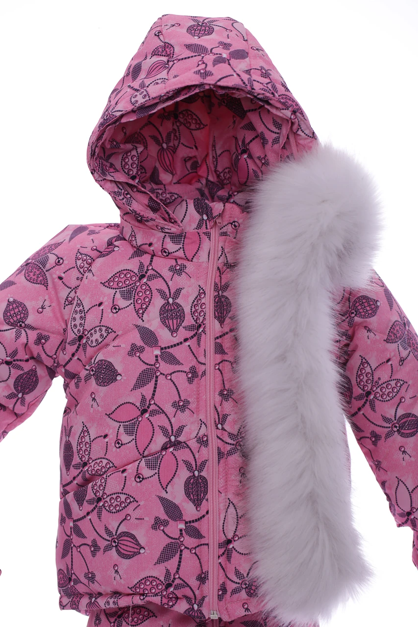Зимовий комбінезон для дівчинки. Зручний комплект, що складається з куртки та напівкомбінезону, які можна носити як разом, так і окремо. Легкий, теплий і комфортний напівкомбінезон на регульованих бретелях. Штанина з відворотом, що дозволяє регулювати довжину, підлаштовуючись під зростання дитини. Комбінезон не сковує руху, зручний і практичний у носінні. Капюшон і узлісся відстібаються, що робить прання зручним. Верх напівкомбінезону та курточки виконаний з плащівки. Наповнення куртки: холофайбер, який витримує мороз до -20 градусів. Усередині хутряна підкладка. Куртка прикрашена галявиною зі штучного хутра, в наборі йдуть рукавички в тон комплекту.