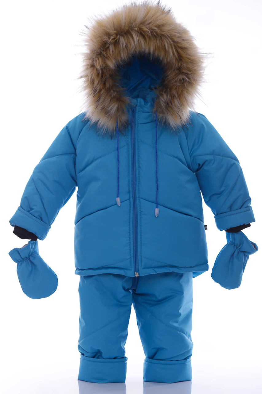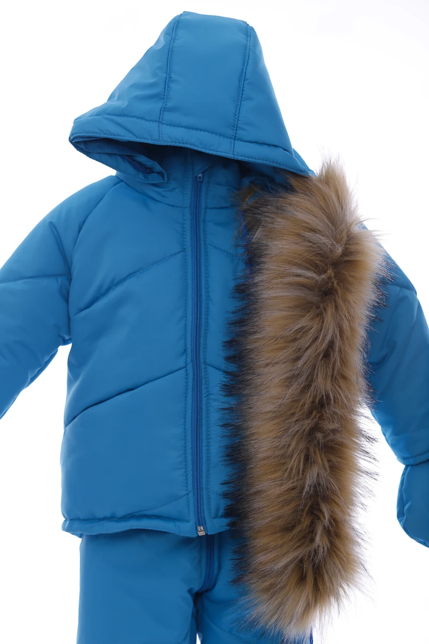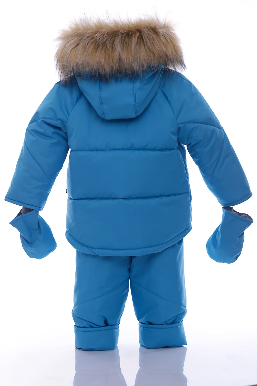 Зимовий комбінезон для хлопчика Зручний комплект, що складається з куртки та напівкомбінезону, які можна носити як разом, так і окремо. Легкий, теплий і комфортний напівкомбінезон на регульованих бретелях. Штанина з відворотом, що дозволяє регулювати довжину, підлаштовуючись під зростання дитини. Комбінезон не сковує руху, зручний і практичний у носінні. Капюшон і узлісся відстібаються, що робить прання зручним. Верх напівкомбінезону та курточки виконаний з плащівки. Наповнення куртки: холофайбер, який витримує мороз до -20 градусів. Усередині хутряна підкладка. Куртка прикрашена галявиною з натурального хутра, у наборі йдуть рукавички в тон комплекту.