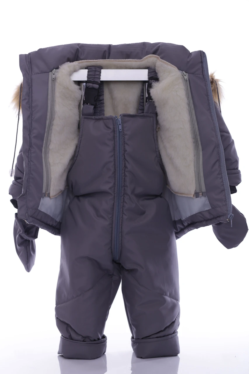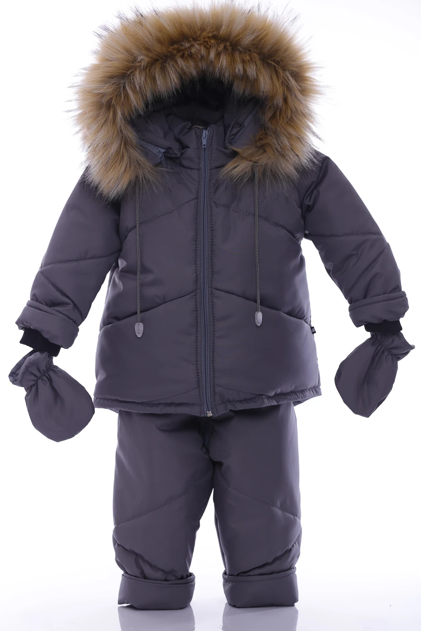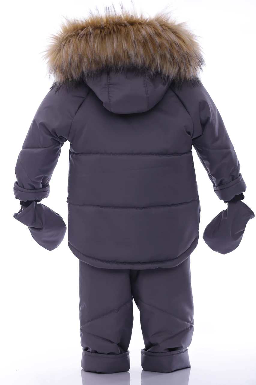 Зимовий комбінезон для хлопчика Зручний комплект, що складається з куртки та напівкомбінезону, які можна носити як разом, так і окремо. Легкий, теплий і комфортний напівкомбінезон на регульованих бретелях. Штанина з відворотом, що дозволяє регулювати довжину, підлаштовуючись під зростання дитини. Комбінезон не сковує руху, зручний і практичний у носінні. Капюшон і узлісся відстібаються, що робить прання зручним. Верх напівкомбінезону та курточки виконаний з плащівки. Наповнення куртки: холофайбер, який витримує мороз до -20 градусів. Усередині хутряна підкладка. Куртка прикрашена галявиною з натурального хутра, у наборі йдуть рукавички в тон комплекту.