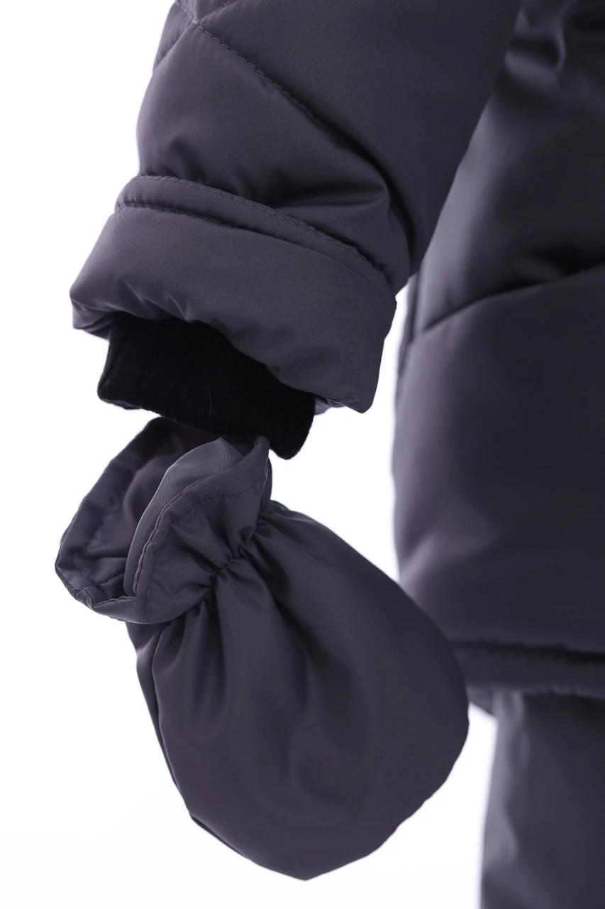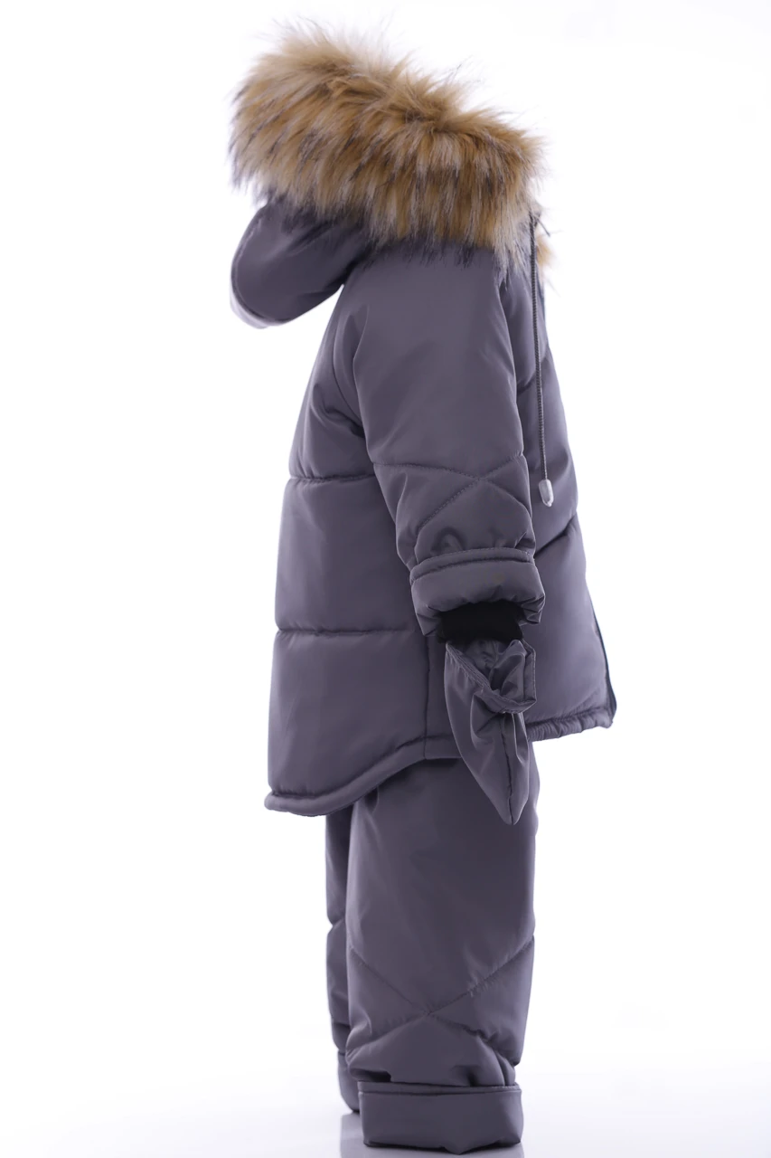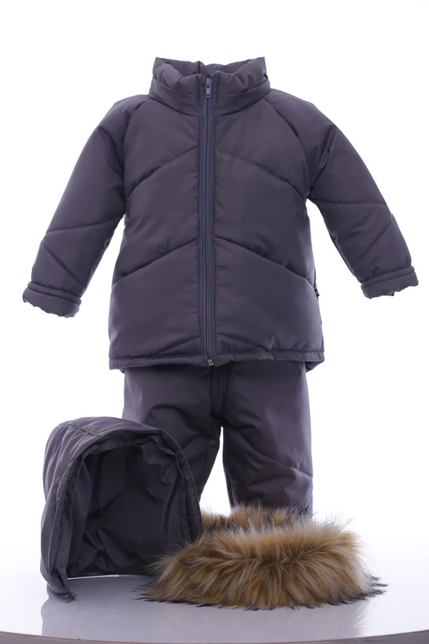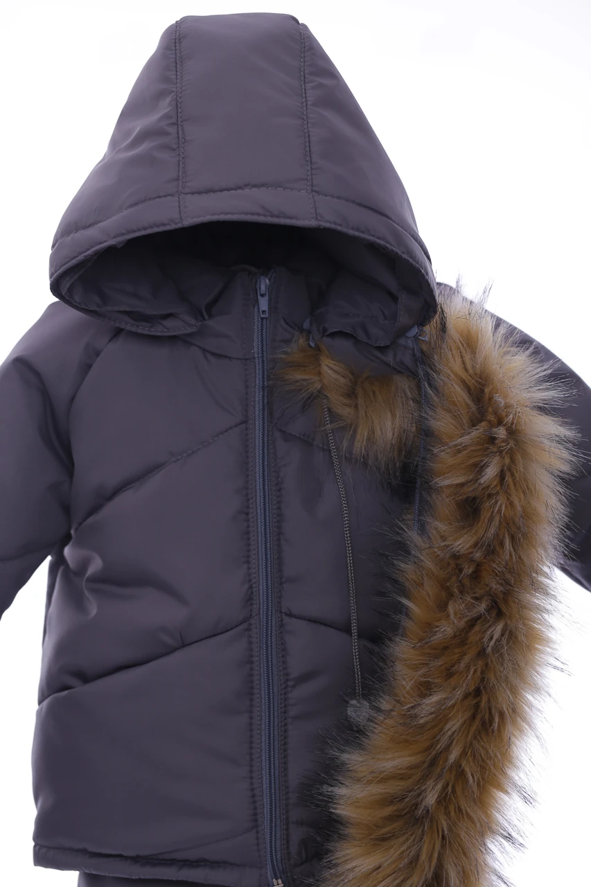 Зимовий комбінезон для хлопчика Зручний комплект, що складається з куртки та напівкомбінезону, які можна носити як разом, так і окремо. Легкий, теплий і комфортний напівкомбінезон на регульованих бретелях. Штанина з відворотом, що дозволяє регулювати довжину, підлаштовуючись під зростання дитини. Комбінезон не сковує руху, зручний і практичний у носінні. Капюшон і узлісся відстібаються, що робить прання зручним. Верх напівкомбінезону та курточки виконаний з плащівки. Наповнення куртки: холофайбер, який витримує мороз до -20 градусів. Усередині хутряна підкладка. Куртка прикрашена галявиною з натурального хутра, у наборі йдуть рукавички в тон комплекту.