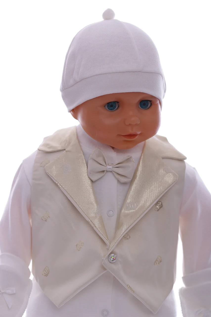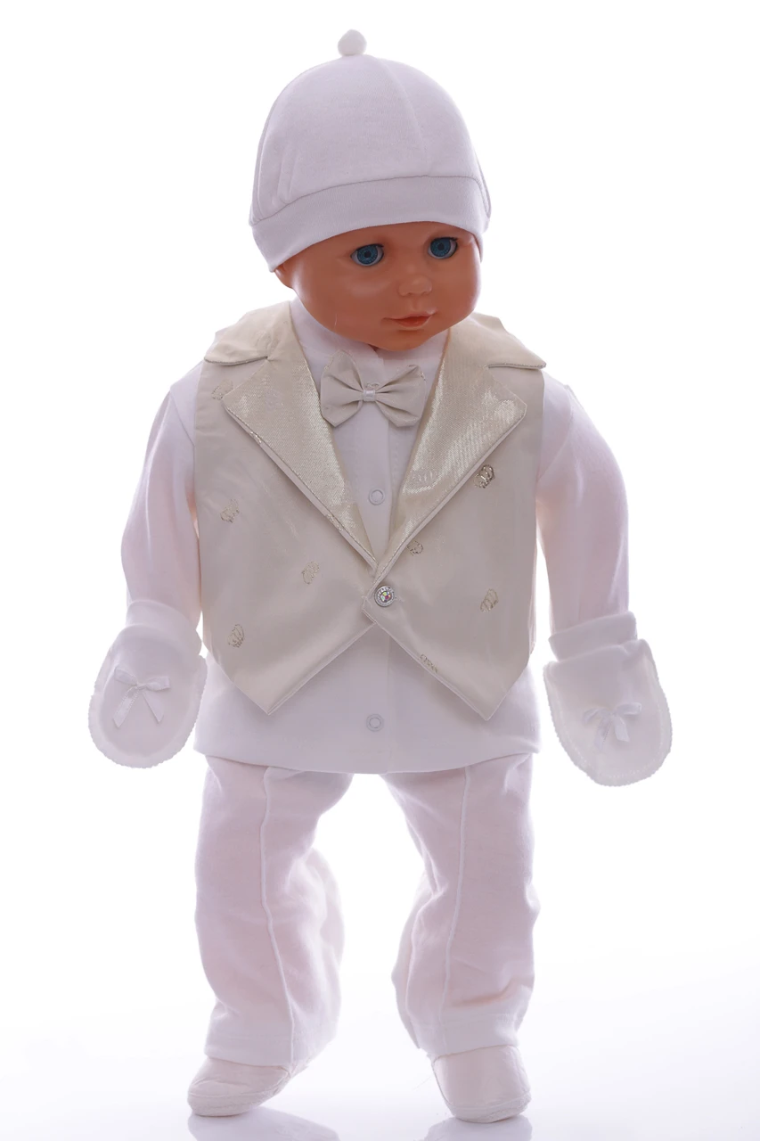 Набір в коробці для хлопчика. У набір входить: трикотажна сорочечка з метеликом, штани, жилет, шапочка, подряпини та пінетки. Відмінний варіант на подарунок близьким, у яких є дітки