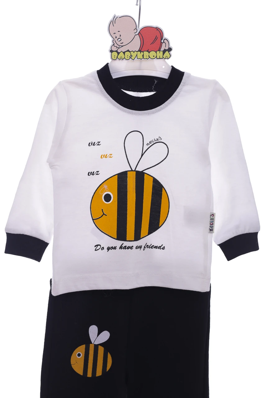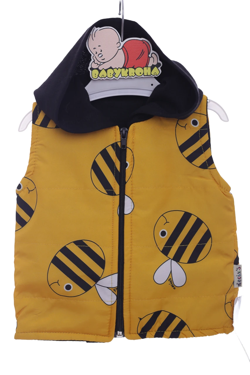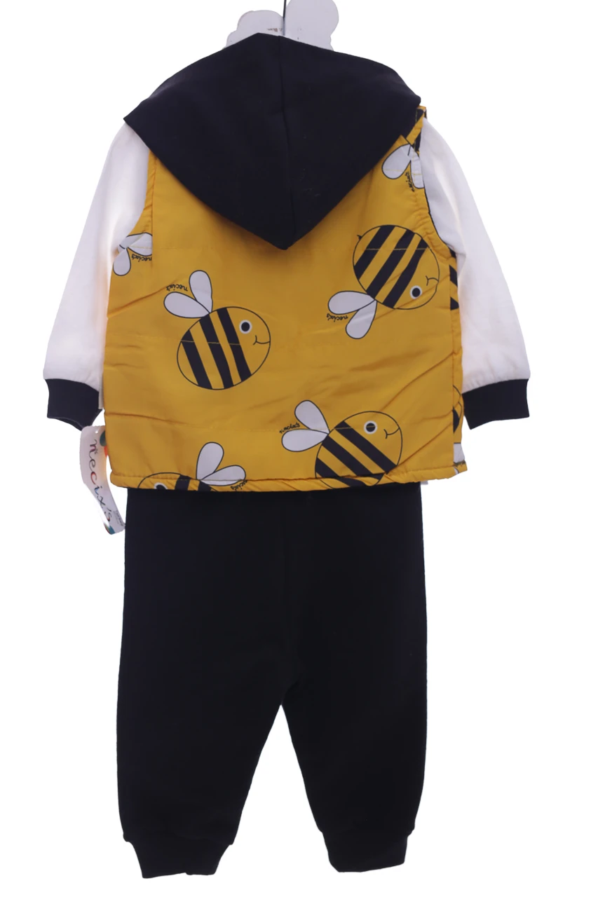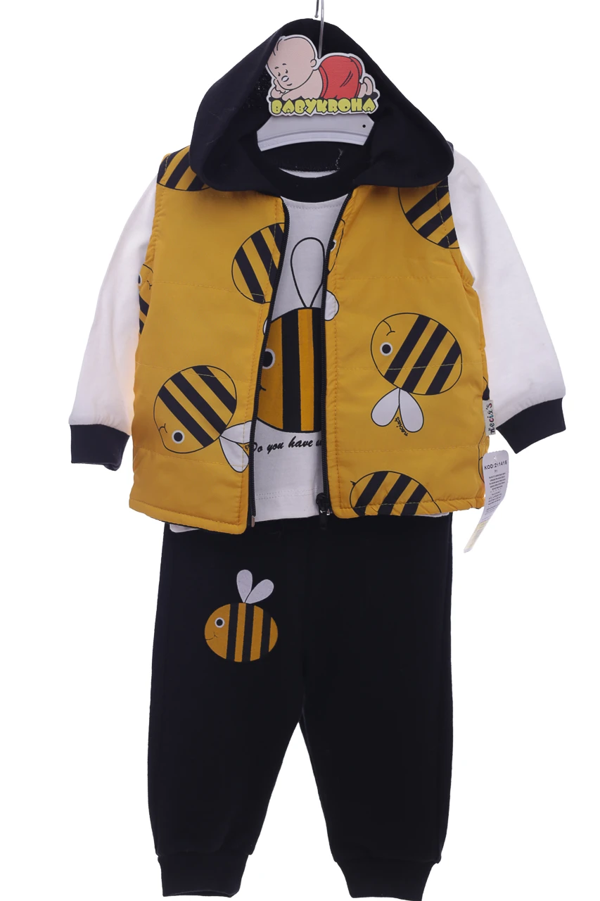 Трикотажний костюм із манжетами, з принтом бджілки. У комплекті йде жилет з плащової тканини на блискавці жовтого кольору. Вироби можна носити окремо, а можна разом. Відмінне поєднання створює повноцінний образ на весну-осінь для хлопчика.