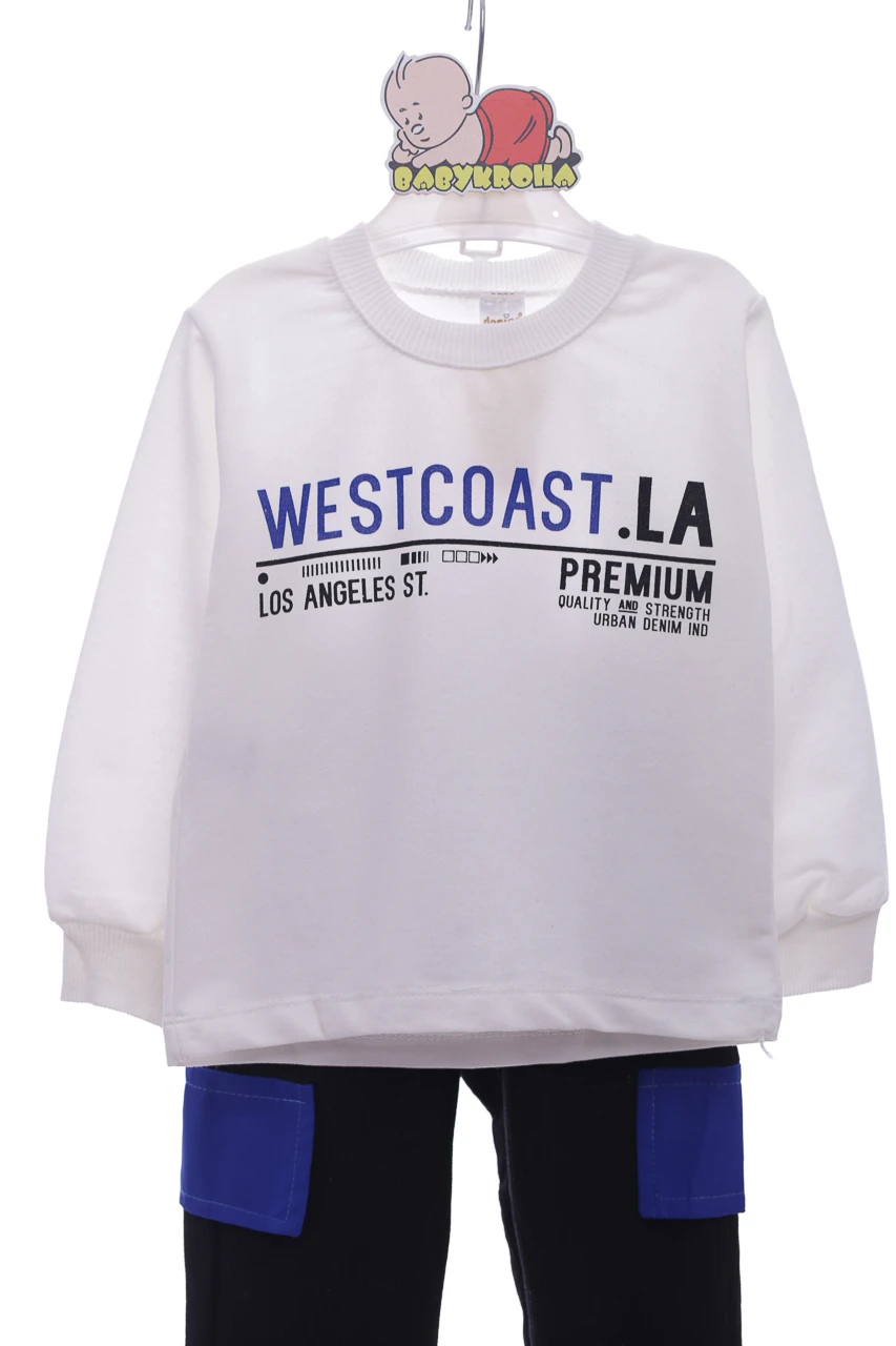 Костюм трикотажний для хлопчика складається зі світшота та штанів та жилетки. На рукавах та штанинах манжети. Можна носити костюмом, можна окремо.