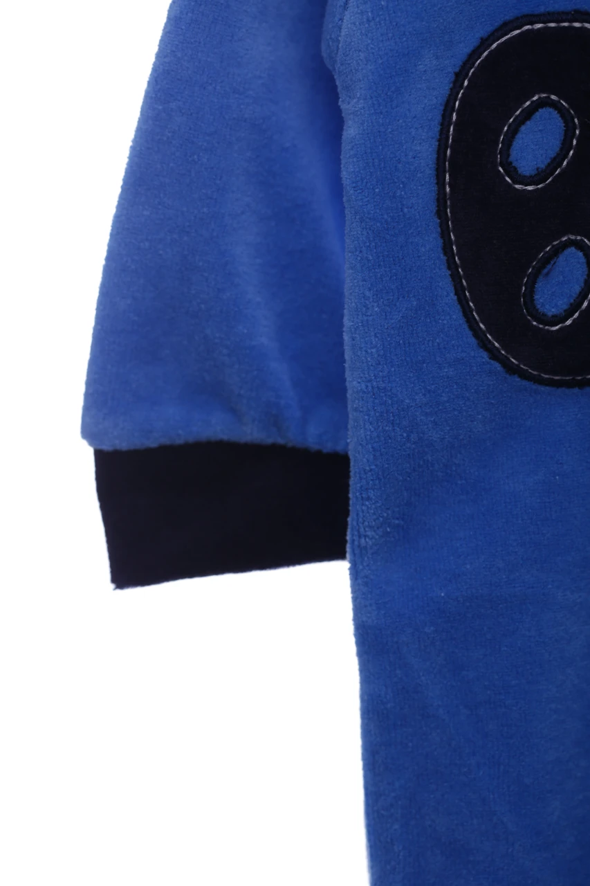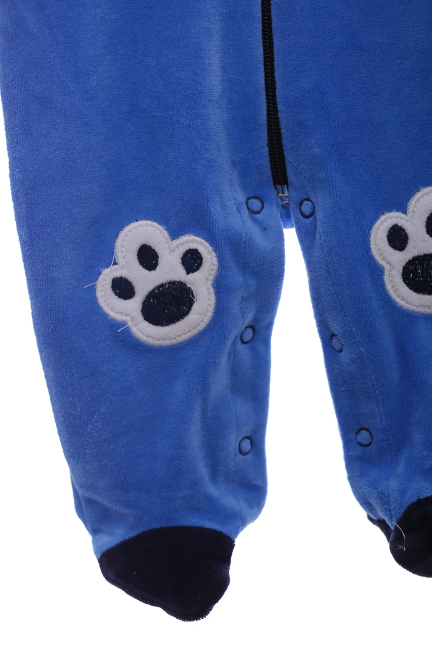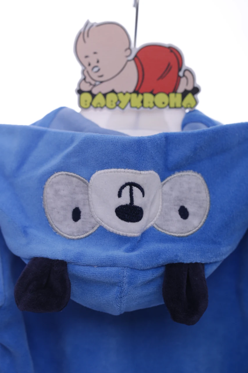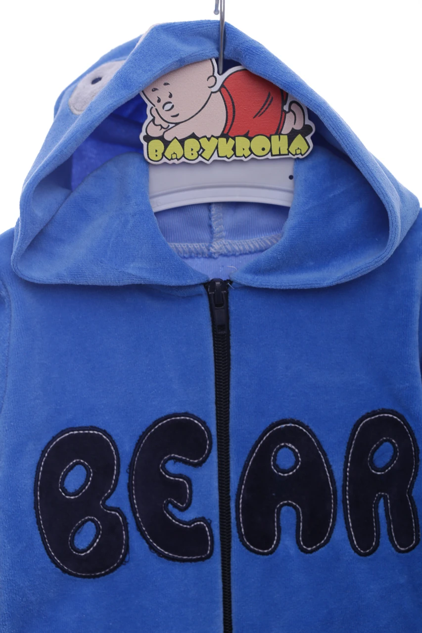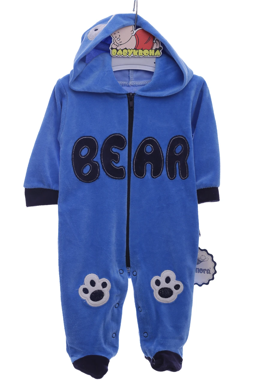 Велюровий чоловічок для хлопчика. Є капюшон із принтом та вушками ведмедя. На рукавах манжети, ніжки зачинені. Блискавка-застібка по довжині, на ніжках кнопочки. Цікава нашивка на колінах у вигляді слідів ведмедика.