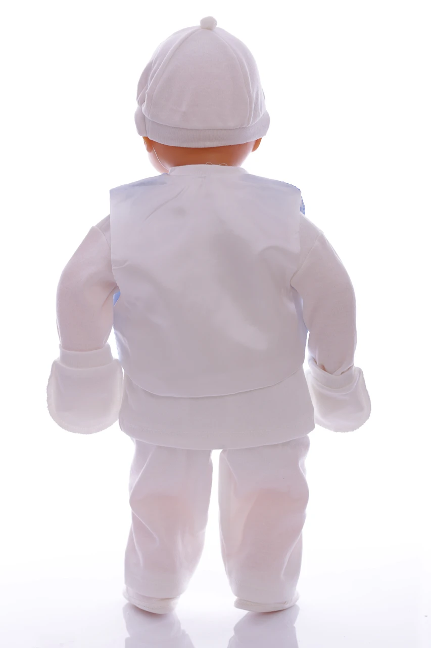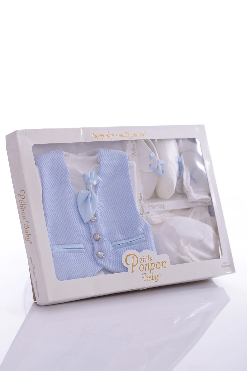 Набір у коробці на виписку з пологового будинку для хлопчика. У набір входить: трикотажна сорочечка з метеликом, штани, жилет, шапочка, подряпини та пінетки. Відмінний варіант на подарунок близьким, у яких є дітки