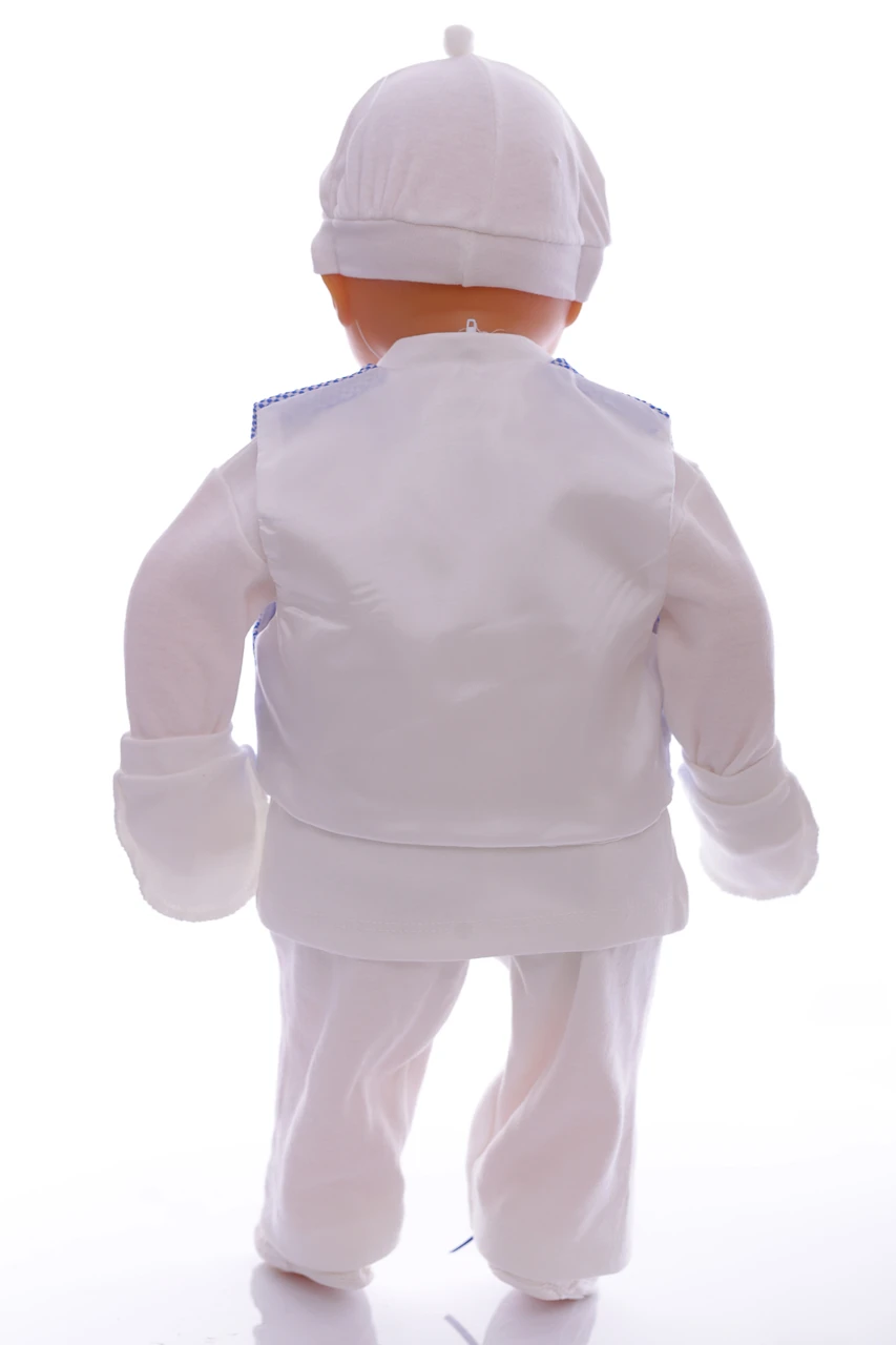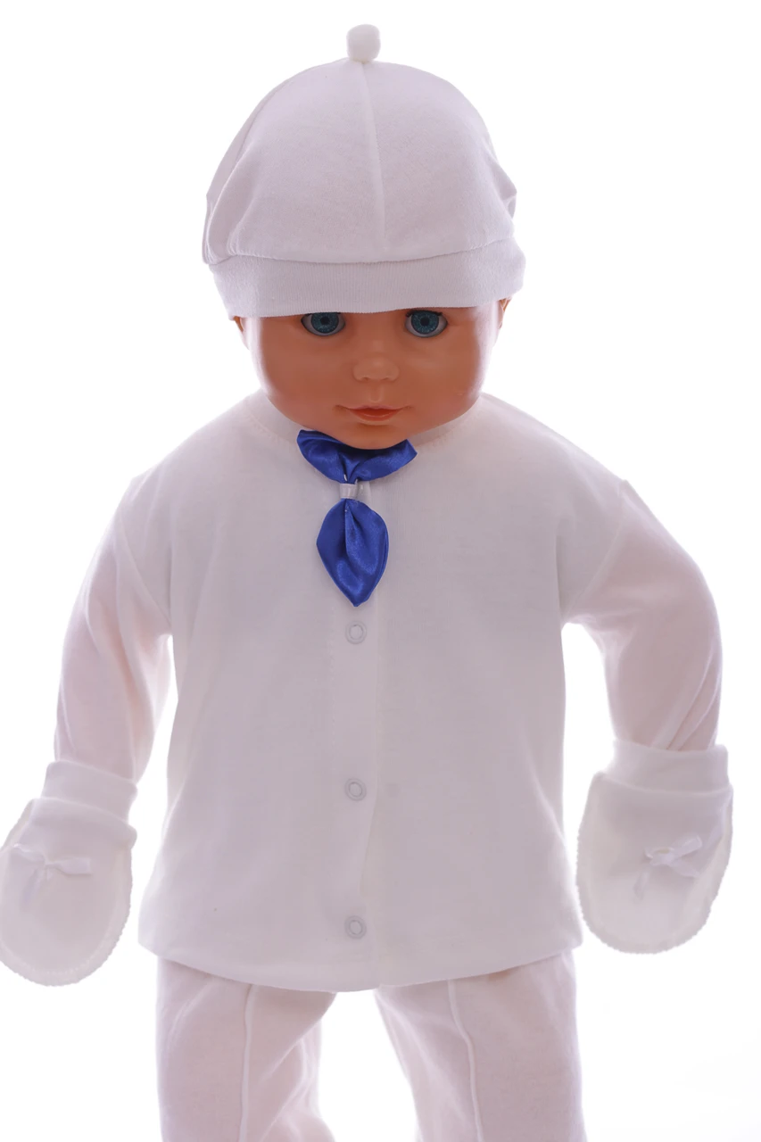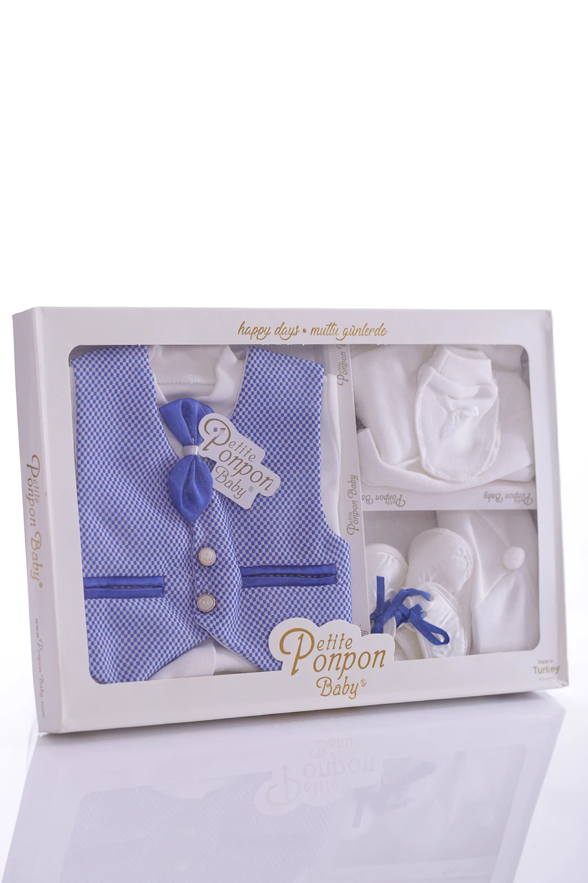 Набір у коробці на виписку з пологового будинку для хлопчика. У набір входить: трикотажна сорочечка з метеликом, штани, жилет, шапочка, подряпини та пінетки. Відмінний варіант на подарунок близьким, у яких є дітки