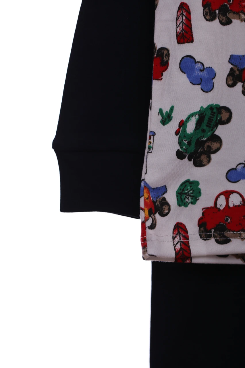 Трикотажні піжами для хлопчика. Піжама складається з штанів та кофти з довгим рукавом. На рукавах та штанях манжети. Тканина трикотаж. Яскравий принт з машинками цієї моделі піжамки. Відмінний варіант на подарунок