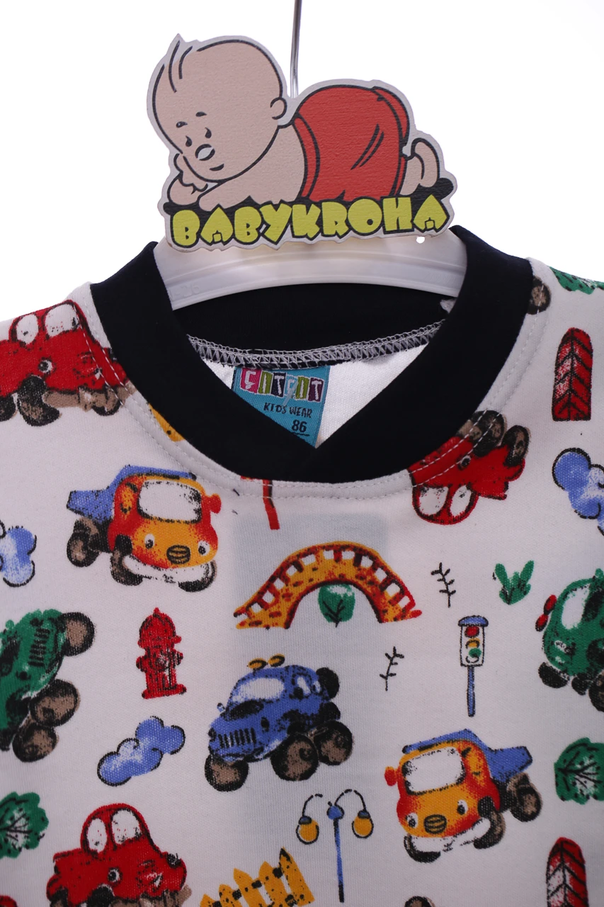 Трикотажні піжами для хлопчика. Піжама складається з штанів та кофти з довгим рукавом. На рукавах та штанях манжети. Тканина трикотаж. Яскравий принт з машинками цієї моделі піжамки. Відмінний варіант на подарунок