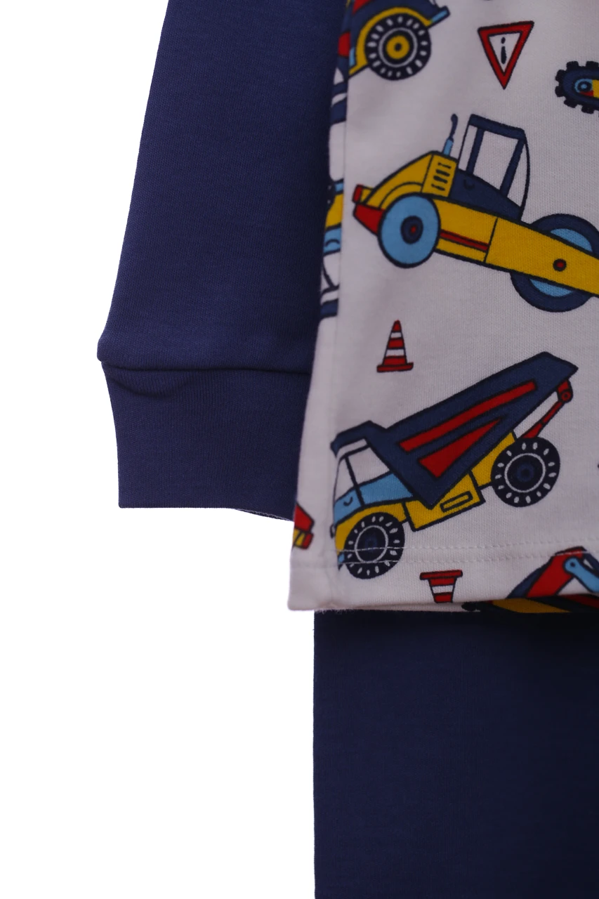 Трикотажні піжами для хлопчика. Піжама складається з штанів та кофти з довгим рукавом. На рукавах та штанях манжети. Тканина трикотаж. Яскравий принт з машинками цієї моделі піжамки. Відмінний варіант на подарунок