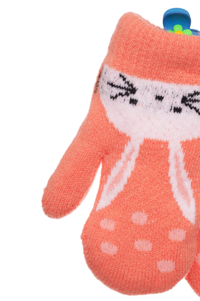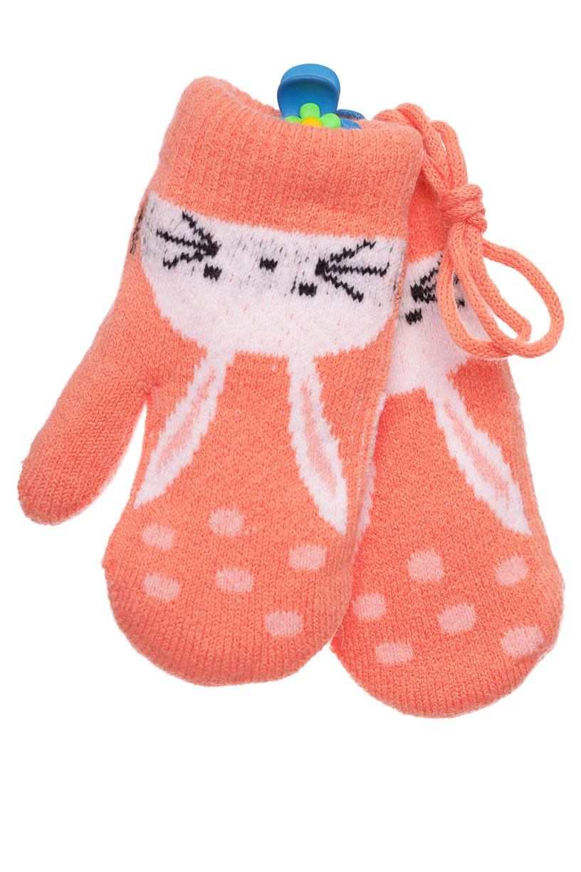 - Рукавички для дівчинки в'язка на траві з зайчиком в помаранчевий горох.