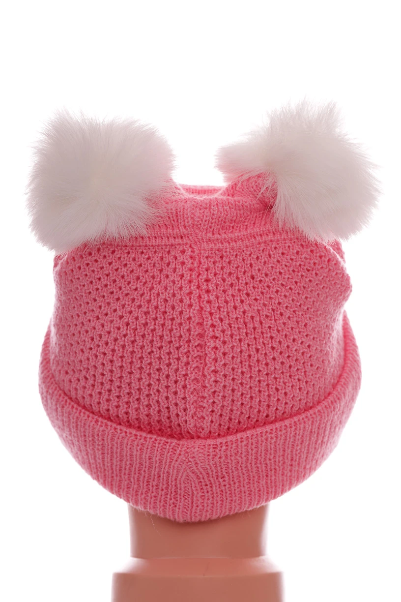 Зимова дитяча шапочка в'язка на флісовій підкладці. Шапка з бубонами та підворотом, декорована намистинами та стразами.