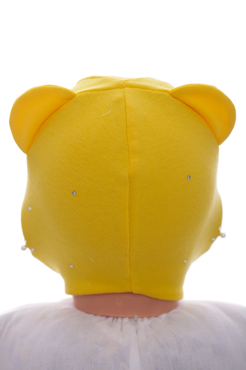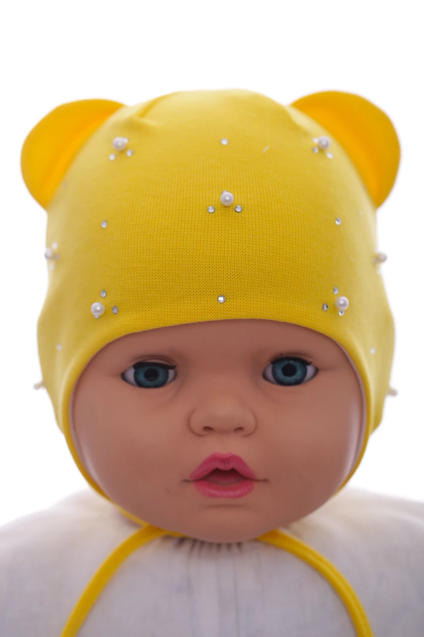 Трикотажна шапочка з вушками для дівчинки. Жовтий колір і стразики виглядає ошатно і в той же час підійде для повсякденного носіння.