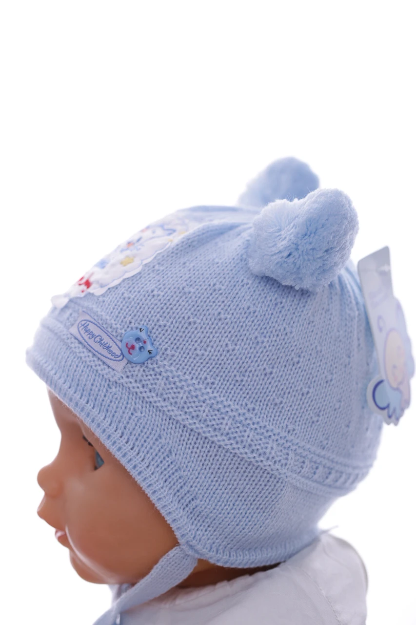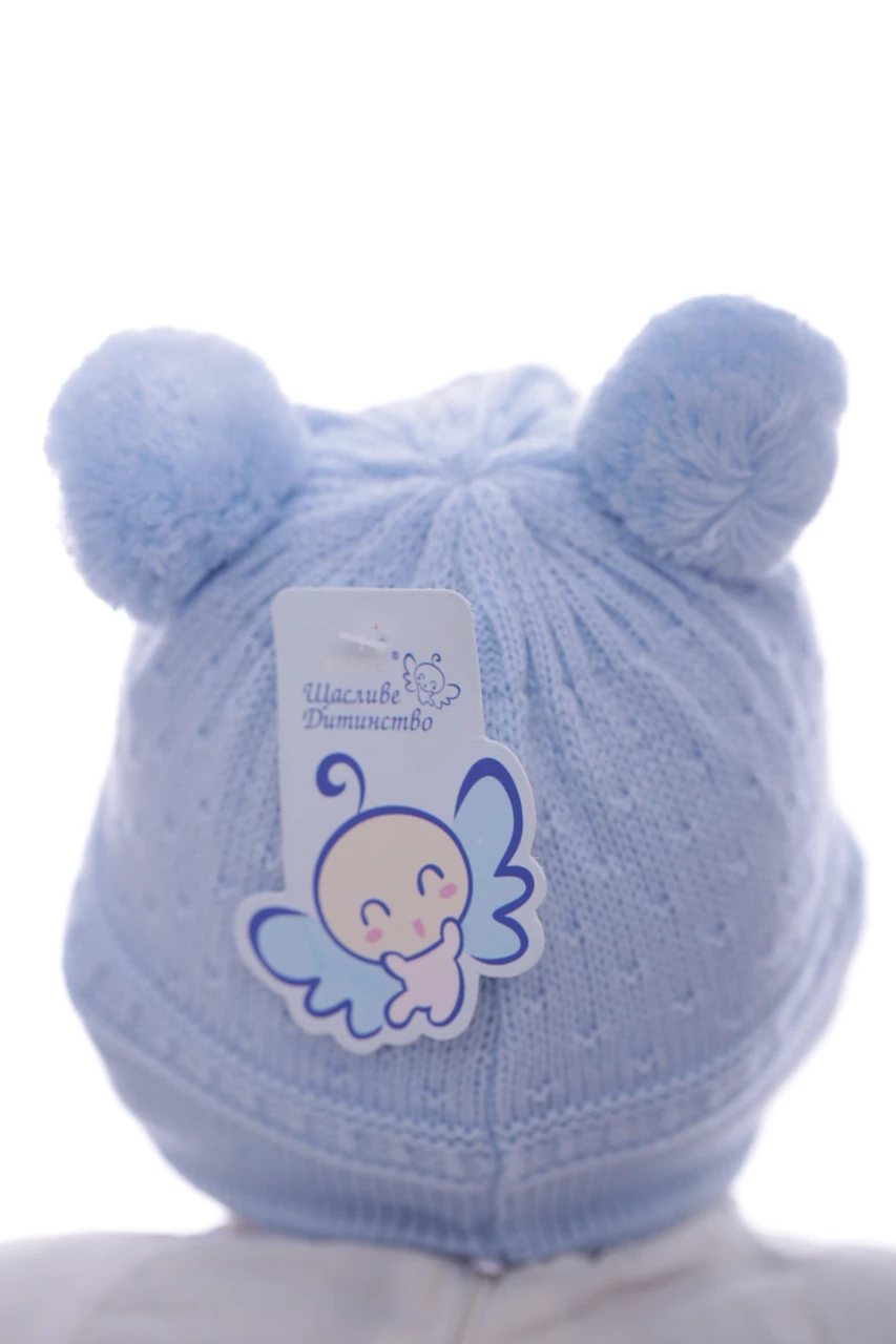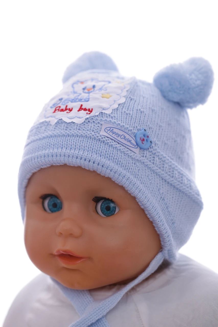 - Шапка для хлопчика в'язка на трикотажі Котик блакитний