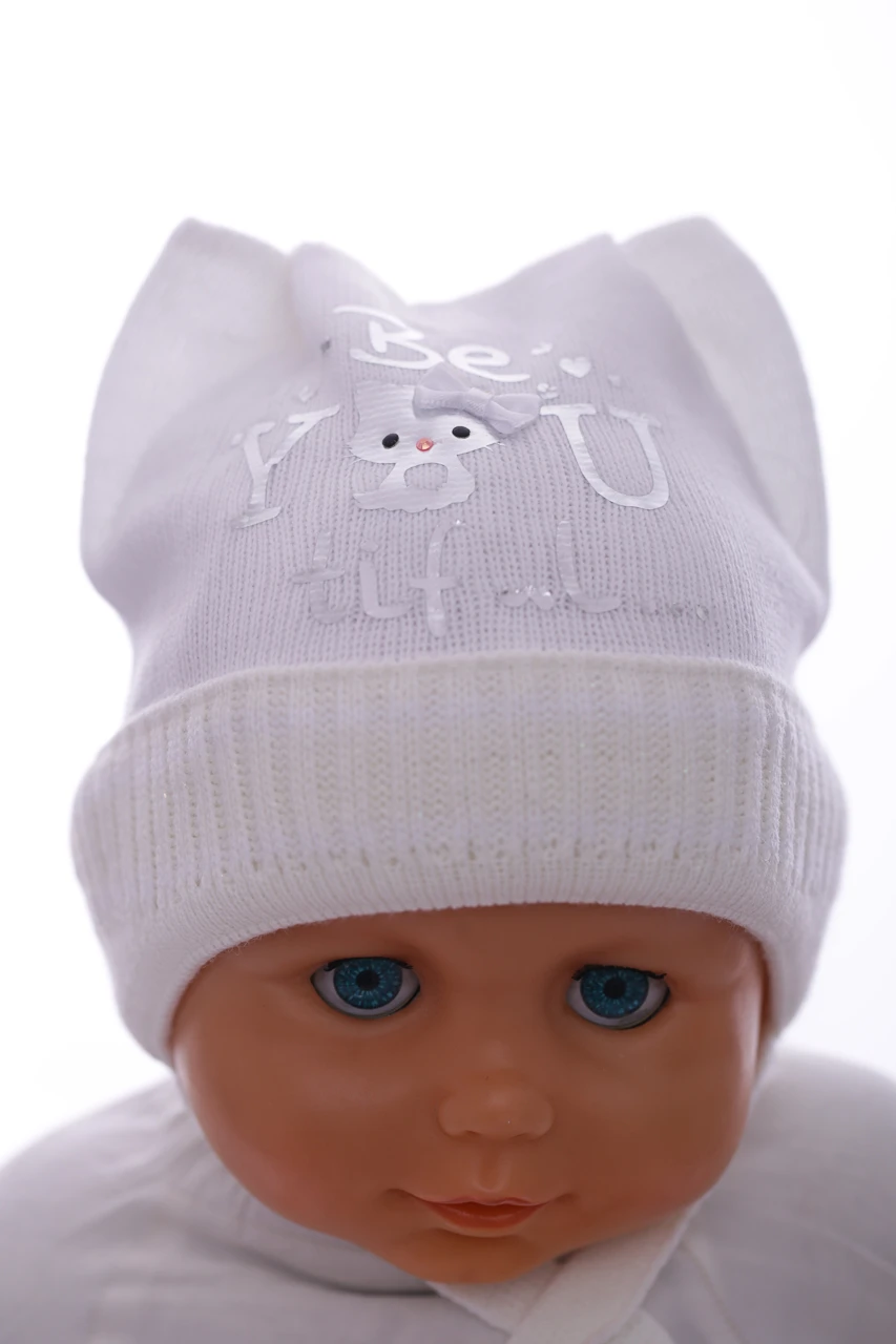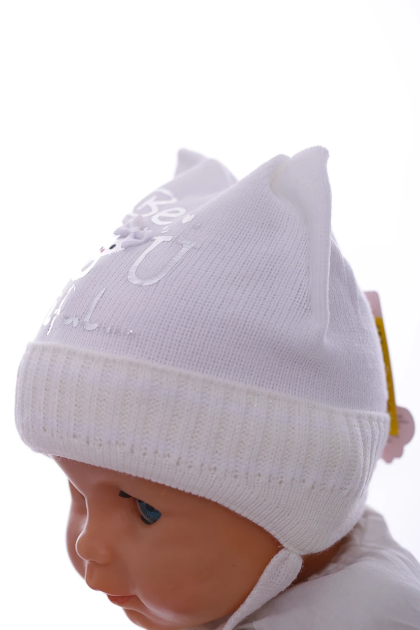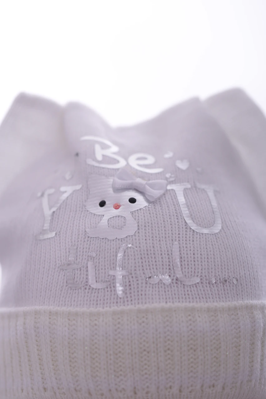 - Шапка в'язка для дівчинки на трикотажі Кішечка молочна