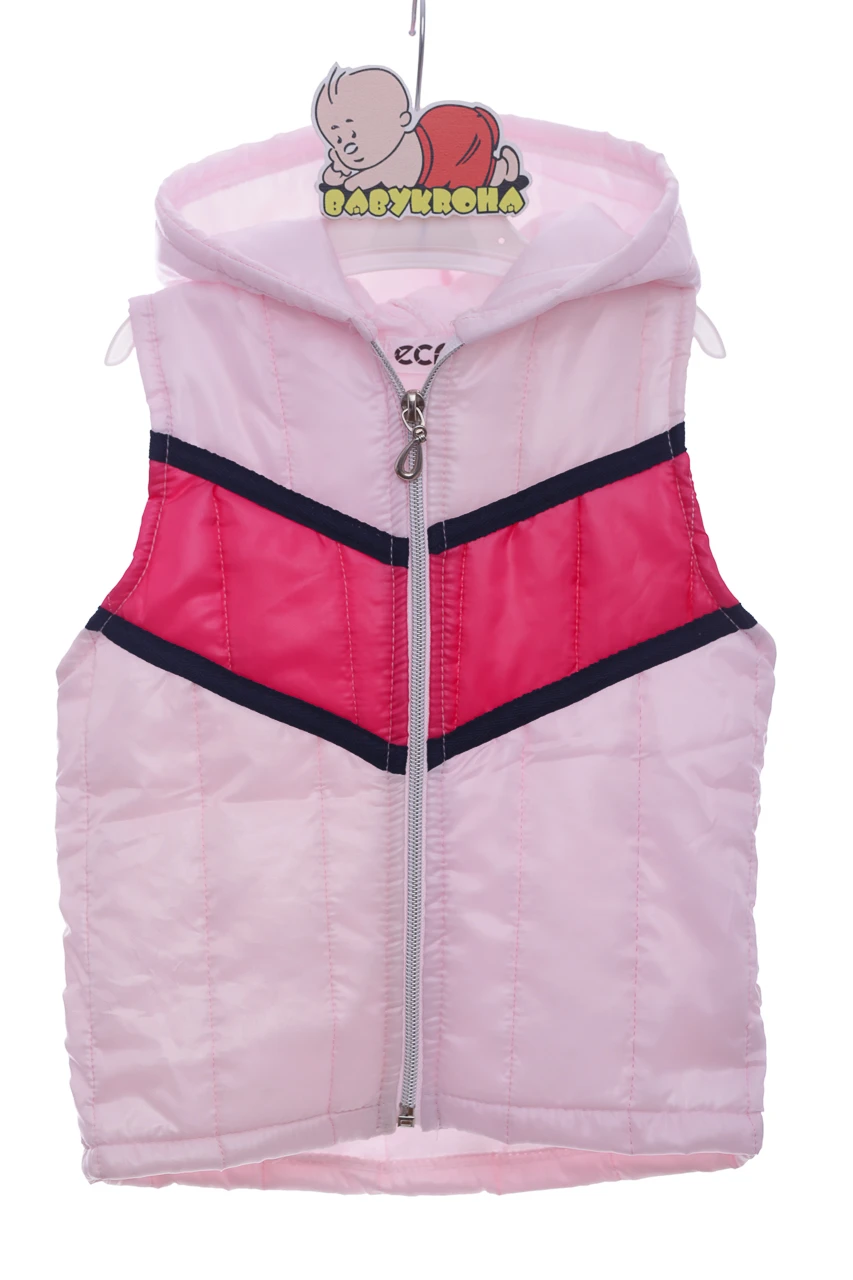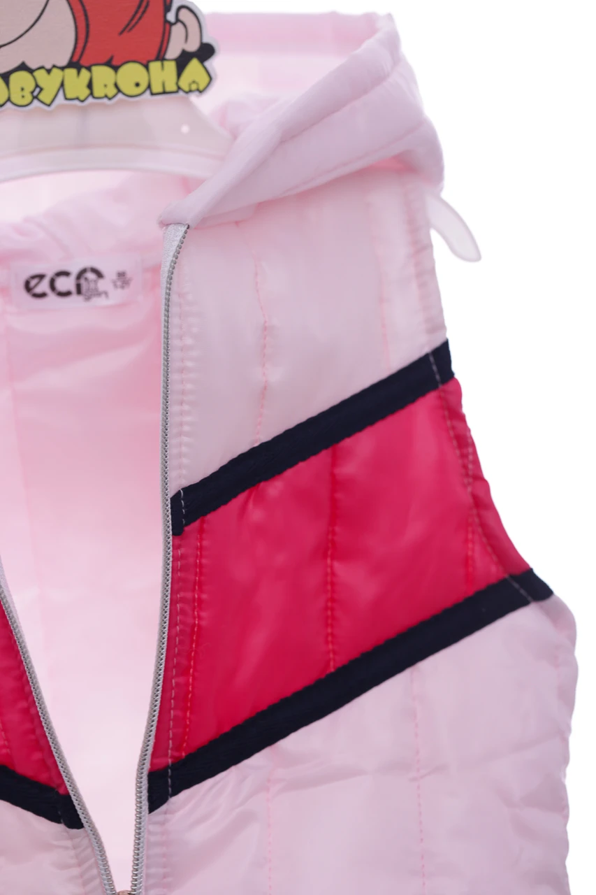 Трикотажний костюм з манжетами, рожево-білого кольору та принтом. У комплекті йде жилет із плащової тканини на блискавці білого кольору. Вироби можна носити окремо, а можна разом. Відмінне поєднання створює повноцінний образ на весну-осінь для дівчинки.
